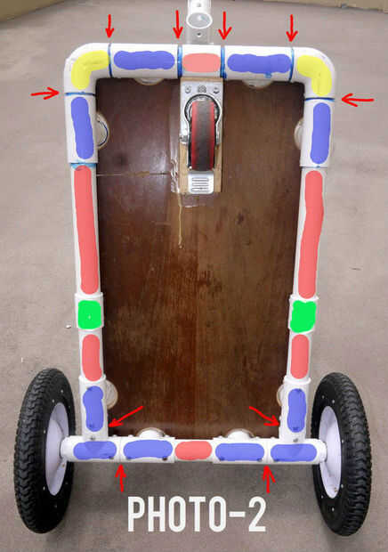 A partir de la plataforma del carro, construir algo parecido a la foto 2 utilizando los aspectos más destacados en la foto como una guía de lo que las juntas de PVC necesita. Las longitudes de la pipa del PVC, en color rojo, pueden ser cualquier longitud para acomodar el tamaño de carro que desee.