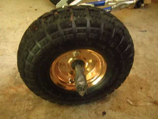 Ahora toma tus 5/8, ruedas de 10 pulgadas y ponerlos en. Para mantenerlos, usted puede ya sea cinta de uso como hizo o utilizar las abrazaderas de manguera es útil siempre que no tengo.