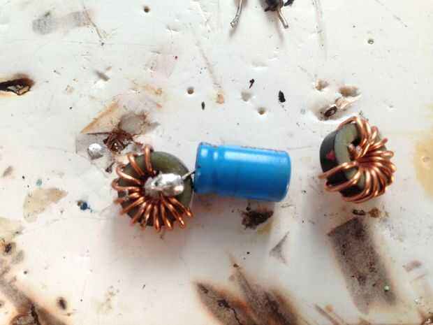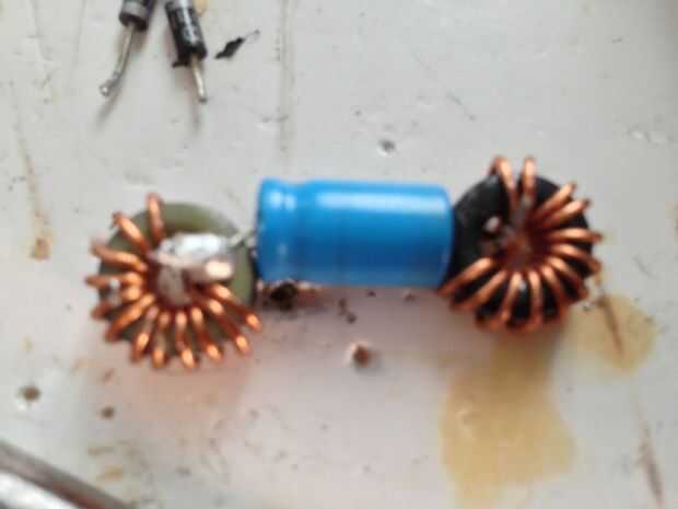 La bobina del toroide tiene dos cables, uno desde cada lado del agujero de la parte de donut. Cada conductor con un conductor en el condensador de la soldadura. Superglue otro toroide de la bobina hasta el plano final del condensador.