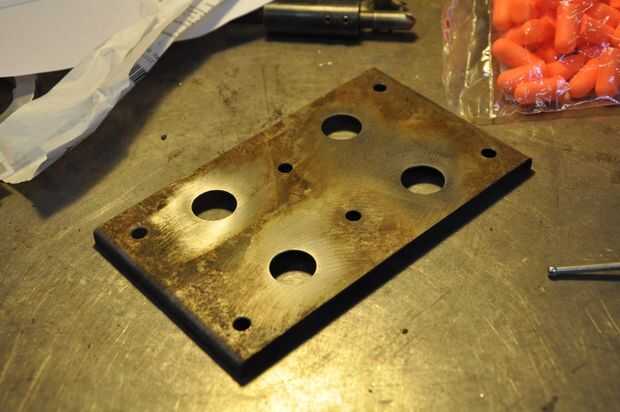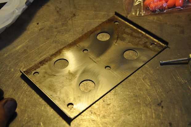 Corte la chapa de acero ligeramente más ancha que la placa de la licencia y la misma altura. Entonces, había trazado los agujeros utilizando un Sharpie®. Bosquejó también aproximadamente donde los agujeros para el soporte de iría, y donde iría el aligeramiento agujeros (Speed®). Después estaba satisfecho con el boceto, había medido con precisión los agujeros y perforar los agujeros. Al taladrar un agujero en la chapa superior a ø1/4 ", yo prefiero usar un poco de paso, o como mi amigo Conor llama, un"Navidad-árboles-bit". Ellos son mucho más seguros, especialmente cuando los agujeros más grandes, ya que tienen menos propensión a agarrar y girar la parte que está trabajando. Además, tienen la ventaja de poner un dulce chaflán en el agujero. Puede desbarbar la parte trasera del agujero (que casi siempre tiene una rebaba antibarro) con la misma broca, ir lento.