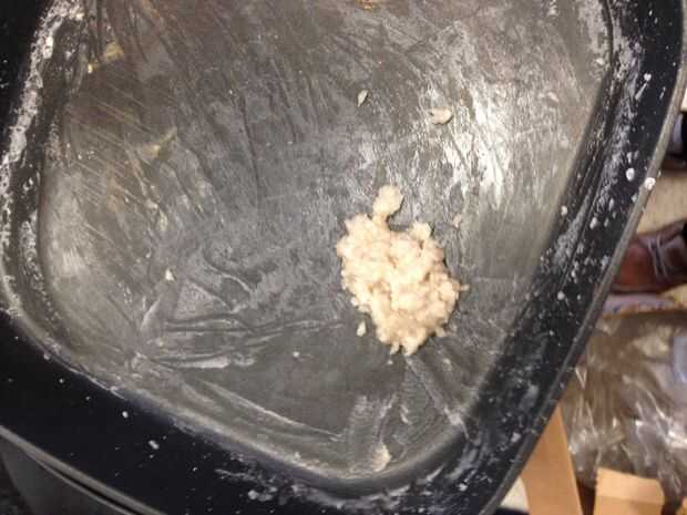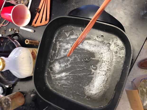 Utilizando la espátula mezcle continuamente la solución y espere hasta que el agua haya hervido apagado tanto cuanto sea posible.  (Mantenga el calor bajo alrededor de 200 grados para evitar la caramelización que se produce alrededor de 320 grados Fahrenheit).  Esto le llevará tiempo así que sea paciente y deje que el agua hierva y se evapore dejando sólo una masilla sobrada.  Permite como mucho agua a quitar como sea posible y luego ir al paso siguiente.