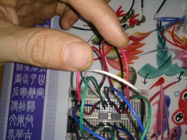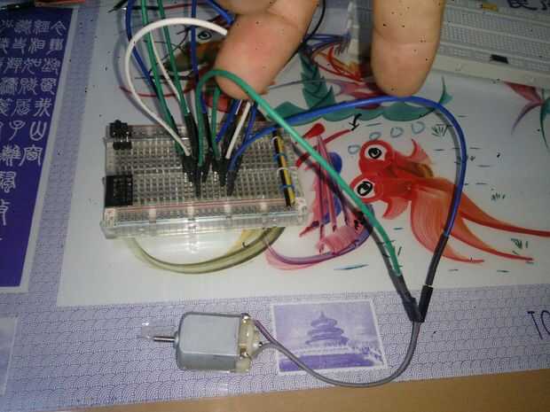 Foto 1: Cable verde conectar el pin 3 del primer chip al terminal del motor. Cable azul conectar el pin 3 del segundo chip al otro terminal.