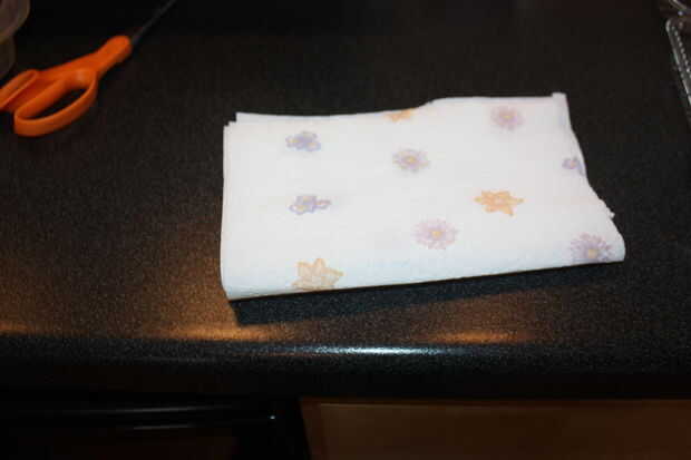 Doble una toalla de papel por lo que cabe en el recipiente de plástico. Asegúrese de que tener al menos tres capas de toallas de papel. La toalla de papel se absorben el agua por lo que el agua no se sentará en el fondo del recipiente.