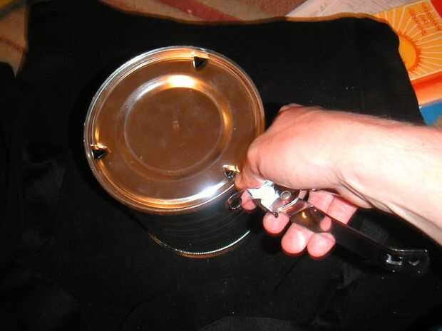 A continuación, perforar tres agujeros más, espaciados uniformemente entre los tres que ya has hecho. Luego, volver y golpear a seis más, otra vez uniformemente espaciadas entre las seis que ya has hecho. Fijar el abrelatas a un lado cuando usted tiene doce agujeros uniformemente espaciados.