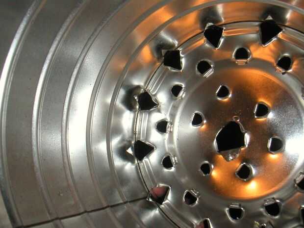 Finalmente, perfore seis agujeros más, utilizando el mismo método, en un anillo alrededor del agujero central. Se muestra la parrilla acabada, desde el interior, en la imagen final.