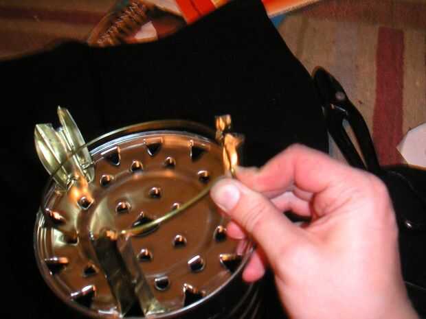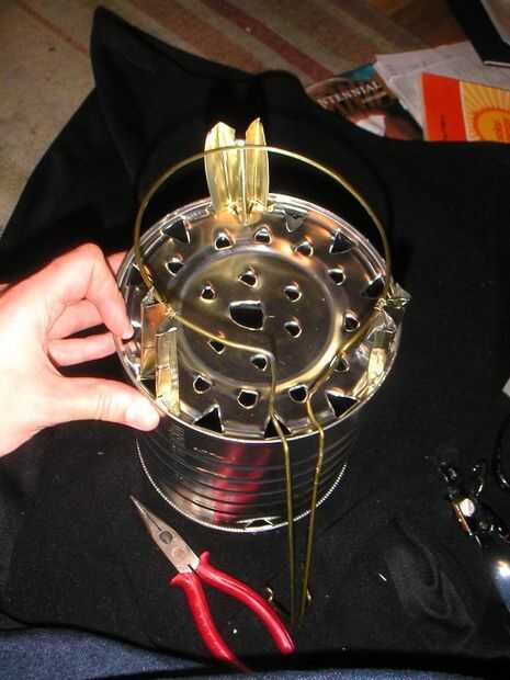 Use el abrelatas una última vez, para perforar un agujero en el lado de la can, cerca de la cima, donde se fije la manija. Ver la sexta foto. Utilizando pinzas, doble este triángulo de acero todo el camino alrededor del borde de la lata y a través del agujero, para que coincida con la séptima foto.