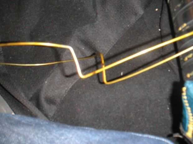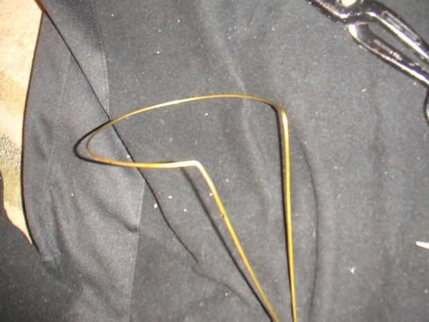 La tercera foto muestra el cable con este segundo conjunto de curvas en ella. Prueba para montar esto en las piernas y averiguar las longitudes largas y rectas de cable encuentran, entre el borde de la lata. Doblar los alambres de arriba y más en este punto, como se muestra en la figura cuarto; Este tercer conjunto de curvas evitará el mango tirando contra los pies.