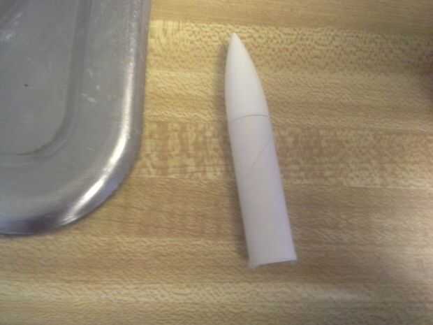 Una normal SRB (Solid Rocket Booster) tiene un cónico, zona ahuecada hacia fuera en la base, lo que facilita una combustión más rápida, más fácil y más completa. Para conseguirlo sólo usé la nariz que vinieron con el cohete modelo, solo quitar, voltearlo y conecte el extremo del tubo de cartón como se muestra en la segunda foto.