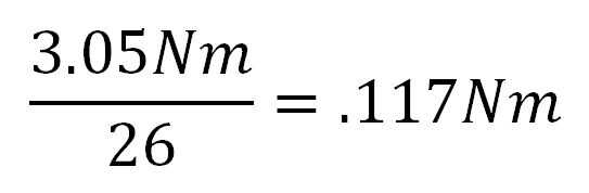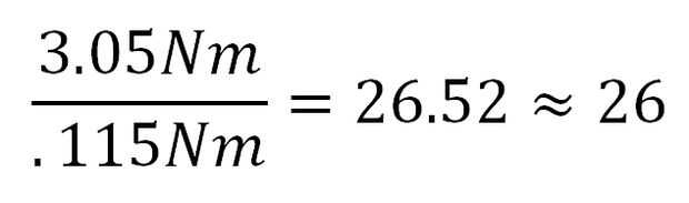 En primer lugar, queremos que el motor no dibujar más de 40 A y soplar un interruptor de circuito. Mirando el gráfico, podemos visualmente vemos que lleva una carga de.23 Nm para la RS-550 a 40 A. Para asegurar que el motor no puede llegar, incluso bajo carga pesada, vamos a tratar de diseñar para una corriente de 20 A. Mirar otra vez el gráfico, vemos que esto corresponde a un par de.115 Nm. Ahora, podemos calcular la reducción sería necesario para lograr el torque necesario de 3.05 Nm.
