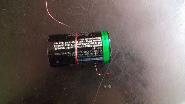 Guíese por la batería de la célula de D y enrolle el cable alrededor de la batería y envolver el alambre extra alrededor de la bobina recién formado.