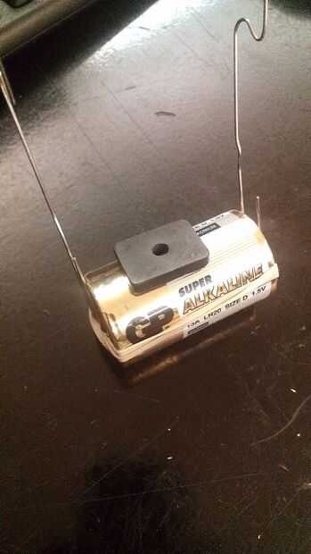 Insertar los clips de papel a ambos lados de la batería en el elástico. Colocar un imán en el medio de la batería.