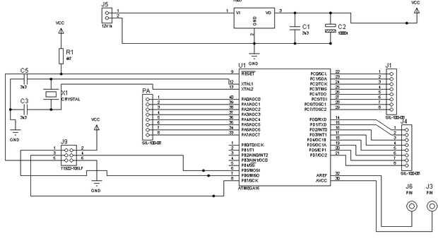 Regulador Micro cualquier trabajará para este circuito depende de lo que tienes en el mercado y el precio, en mi caso hice circuito de desarrollo Atmega16 simple como se muestra en la imagen.