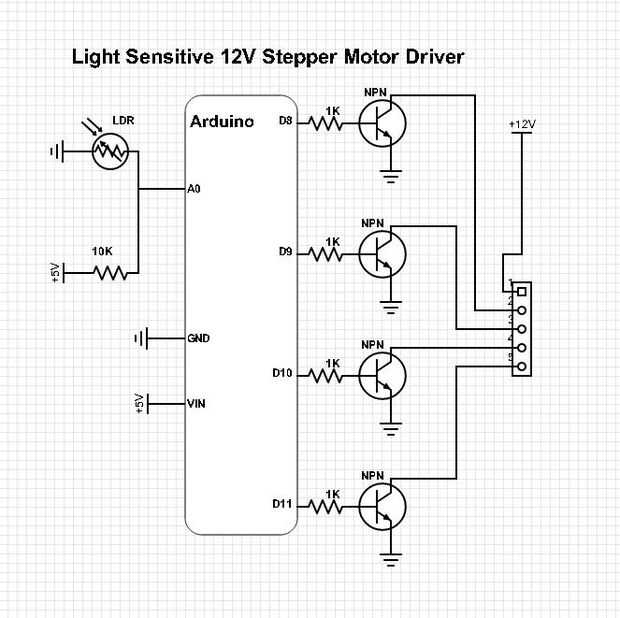 He subido con una manera simple de hacer un movimiento de motor paso a paso de una posición a otra basada en la iluminación en una habitación. Con un puñado de componentes básicos tenía por ahí, sin necesidad de motor de lujo / protectores de paso a paso. Esta configuración podría utilizarse para automatizar persianas, para que abra y cierre basaban en la luz ambiental. El código le permite editar la cantidad de pasos en la dirección y la sensibilidad a la luz. También he escribí en código para desactivar el paso a paso una vez que se hace móvil. Los componentes necesarios son: placa Arduino con 4 digitales salidas y 1 entrada, 4 analógicas x transistores npn de propósito general, 4 resistencias de 1 k, resistencia de 10 k, luz resistor dependiente (LDR), 12 voltios motor de paso a paso, fuente de alimentación de 12 voltios, fuente de alimentación de 5 voltios para el arduino, utilicé un 5 7805 regulador de voltios para esto.