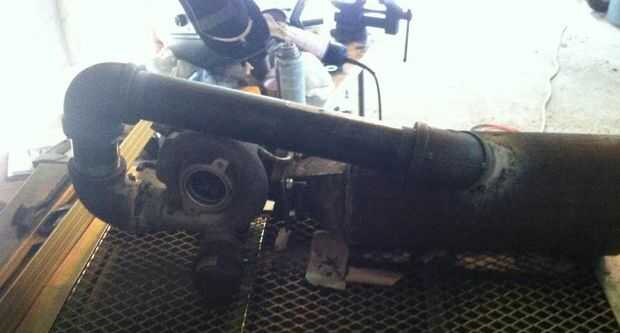 La cámara de combustión totalmente terminada ahora puede conectarse el turbo, vía el reductor que se fabricó anteriormente. La placa en el reductor debe encajar sobre las varillas roscadas desde el turbo, y las tuercas pueden enroscarse en sobre ellos para apretar en el lugar.