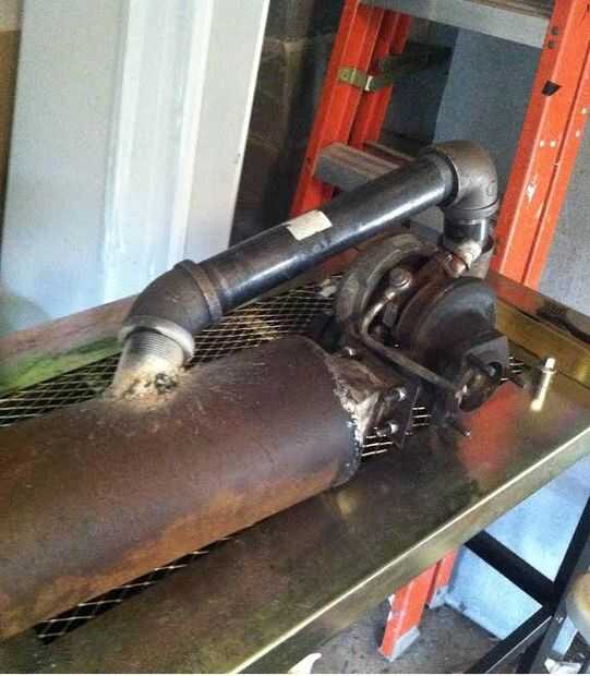 La última parte de la Asamblea es conectar la salida de la final del compresor del turbo a la carcasa de la cámara de combustión. Esto funciona para forzar el aire en los orificios del tubo de llama y permite una combustión en el tubo de llama, que es forzado en la turbina del turbo. El giro de la turbina también gira el ventilador de consumo y permite al sistema continuar funcionando. Utilizamos fontanería Tubo negro para esto, ya que era fácilmente disponible en las tiendas de mejoras para el hogar y puede adquirirse en las secciones roscadas. Las partes que conectado a la salida del turbo y la entrada de la cámara eran soldadas en. El pedazo de tubo conectado a la cámara debían molerse en una forma que cabría al ras contra el lado del tubo exterior de la cámara de combustión.