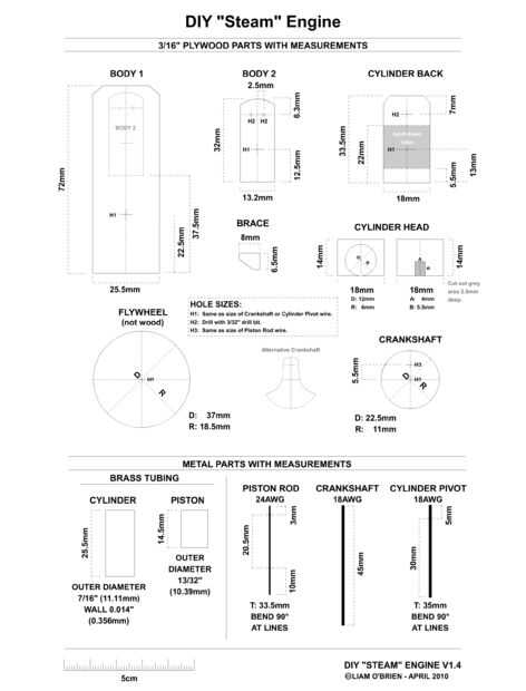 Unidos son los dos archivos PDF. "Las piezas solamente con la medida" incluyen una disposición de todas las piezas que necesita para cortar de madera, así como las longitudes de cable y piezas de tubería de latón. "Sólo piezas sin medidas" es exactamente lo mismo pero sin cualquier medida impresa en la página; buena para cortar y pegar a su madera como guía.