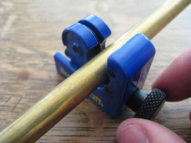 Usar una tubería cortador alinear el corte con la cuchilla del cortador y apriete la perilla, no demasiado apretada aunque como para no aplastar el tubo. Gire lentamente el tubo dentro del dispositivo al apretar la perilla cada pocas vueltas hasta que el disco corte a través del tubo. Puede tomar unas pocas carreras de práctica, que terminó por aplastar el tubo demasiado mucho varias veces.