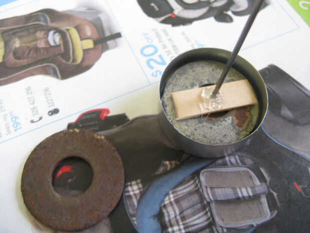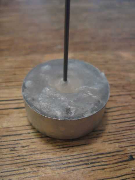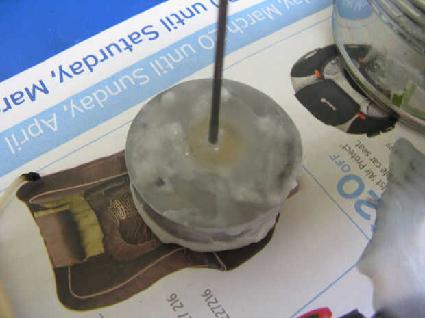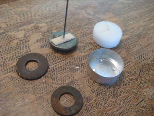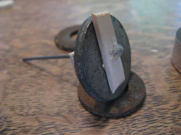 Para hacer el volante apareció la cera de una luz de té (vela), inserta el alambre del cigüeñal a través de unas piezas de madera para evitar que se salga de la cera y había pegado en el cigüeñal, luego agregué algunas arandelas de metal (para añadir peso). A continuación pongo todo este regreso en el té ligero y vierte la cera derretida hacia en mantener todo en su lugar. Esperemos que las imágenes a continuación a explicar mejor este proceso.