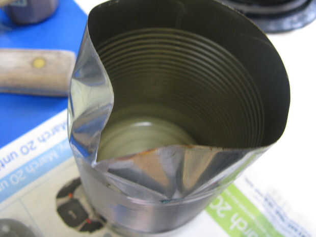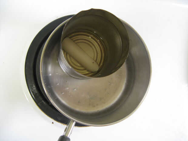 Para derretir la cera lo pongo en la parte inferior de una lata que había doblado un poco de un surtidor en para hacerlo más fácil de verter. Luego poner la lata en una olla de agua hirviendo sobre la estufa hasta que la cera derretida.