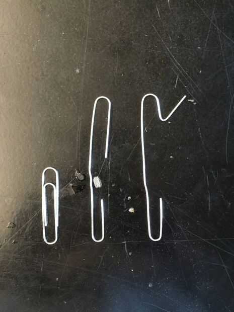 -Alisar los clips de papel y luego doblar hacia atrás el extremo más grande para crear una base. Hacer esto para ambos clips de papel. La imagen muestra cómo doblar en pasos.