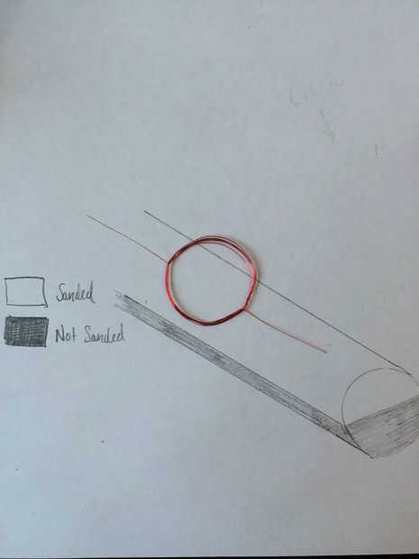 -Utilizando papel de lija, arena completamente la capa coloreada el alambre del imán en un extremo de la bobina. En el otro extremo, la arena media la capa apagado, dejando a un lado aislado por la capa.