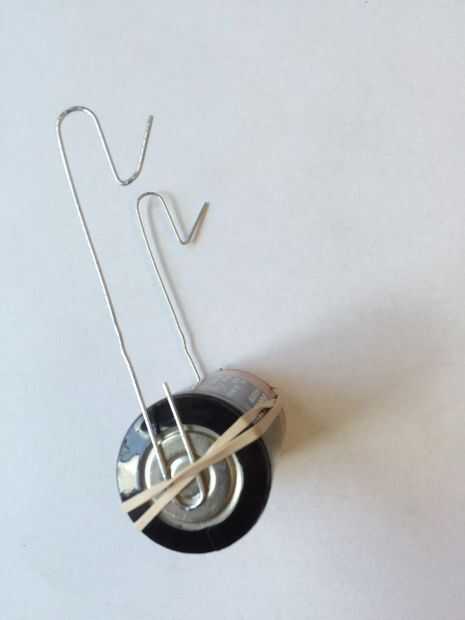 -Utilizar la goma elástica para sujetar los extremos de los clips a los terminales positivo y negativo de la batería. Trate de colocar los clips de papel alineados entre sí con las bases hacia fuera.