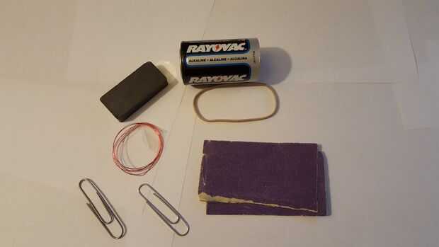 Para crear este motor eléctrico simple, necesitarás:D-pila (1)Clips de papel grandes (2)Banda de goma (1)Imán (1)Alambre de Magneto calibre 26 (brazos una longitud)Papel de lijaCortadores de alambrePaso 1: Enrollar alambre en bobina Tomar el alambre