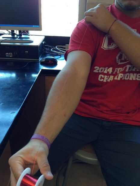 Tome la bobina de alambre en una mano y extienda completamente este brazo. La otra mano y agarrar el extremo del cable y tire al hombro de su brazo extendido. Tener un compañero Sujete el extremo del cable que no está en su hombro, para saber donde cortar el cable. Use las tenazas o alicates para cortar el brazo de alambre.
