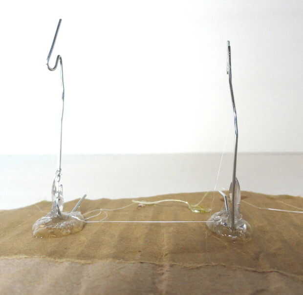 Ahora que tienes los clips de papel doblados, tome un pedazo de cartón y cortarlo a un tamaño que parece adecuado. Utilice su pistola de pegamento caliente y pegamento de los soportes de abajo a la cartulina. Asegúrese de que sus soportes se colocan separados según el ancho de su cable en espiral la cantidad justa.Paso tres