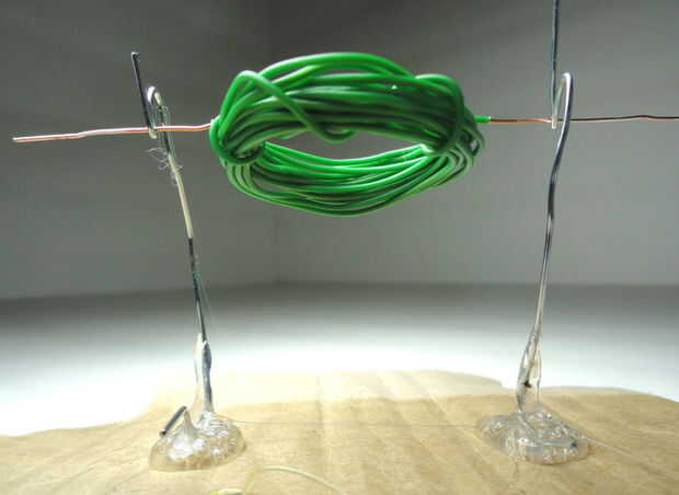 Tome el cable y colóquelo en el soporte. Debe tener buen contacto con el clip y ser bastante nivel. Puede que necesite doblar el lugar de celebración para que la bobina no saltará el soporte como nuestra primera vez empezamos a tenerlo. Debería ver algo como la imagen.