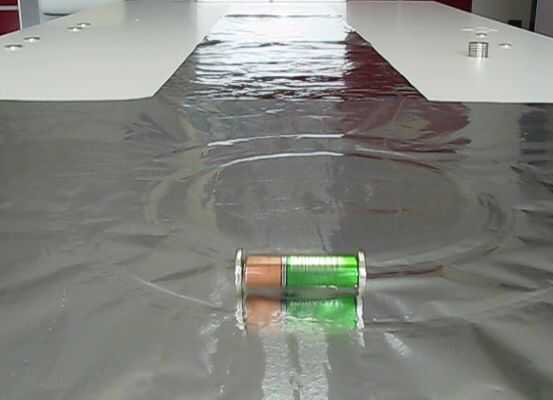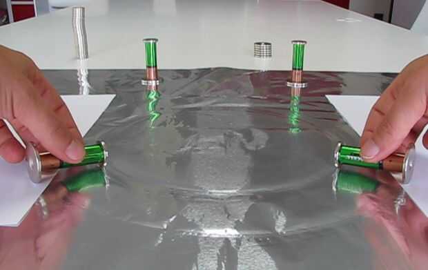 Esta es una nueva versión del motor homopolar. Es necesario que el motor se apoya en un material que conduce la electricidad como el estaño. Colocando el motor en el papel de aluminio, la batería es cortocircuito y en el aluminio crea un campo electromagnético. Este campo electromagnético interactúa con el campo magnético de los imanes de neodimio moviendo el motor.