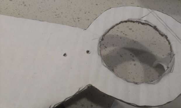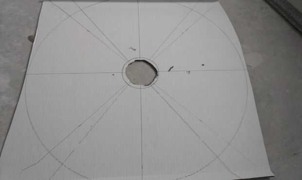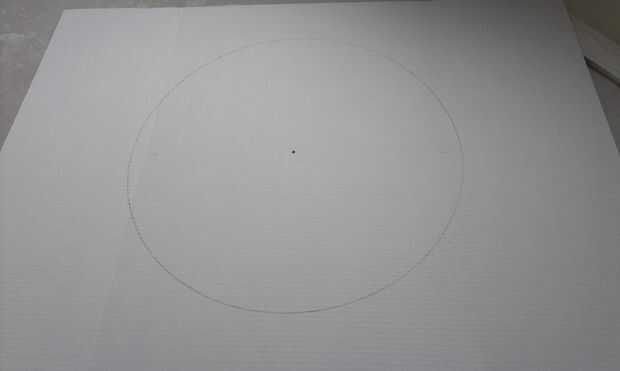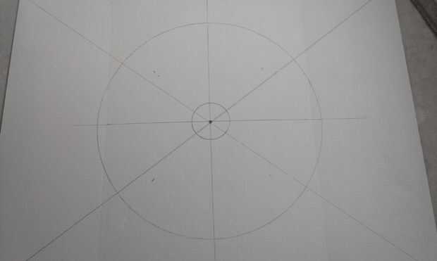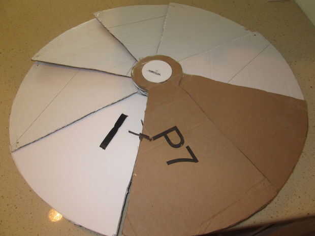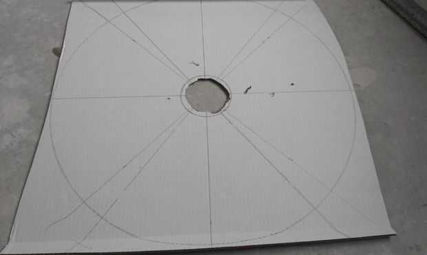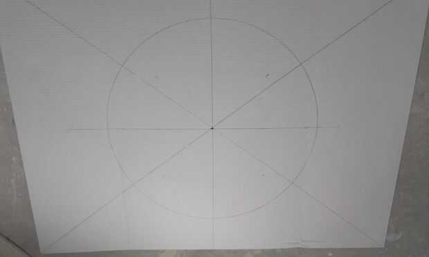 En primer lugar permite empezar por acostado el cartón en el piso y dibuja un círculo. (tamaño incumbe a usted) Mi escudo es 32" de diámetro. Ver pix 1. Ahora dibujar 8 secciones iguales en el círculo. Ver pix 2. Entonces agarra el acoplamiento de PVC de 2", coloque en el centro del escudo y remontar hacia fuera. Ver pix 3. Luego dibuja otro círculo de 3/4" fuera el centro del círculo. Ver pix 4 y 5.