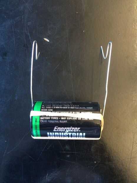 Coloque un clip de papel en el lado positivo de la batería sujeta en su lugar con las bandas de goma y coloque el clip en el lado negativo de la batería sujeta en su lugar con las bandas de goma.