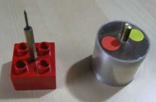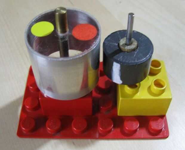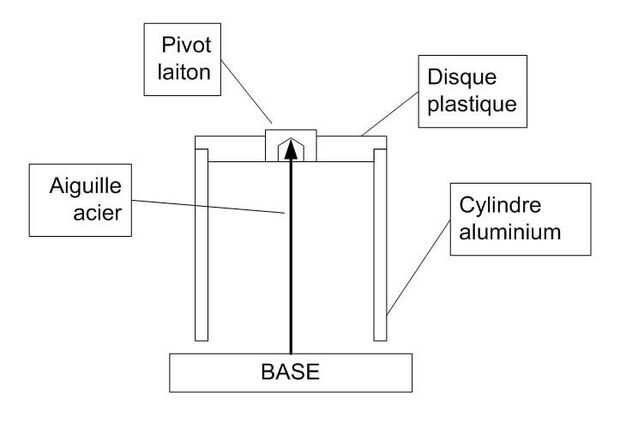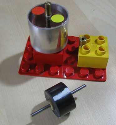 Hice un rotor de un diámetro de 30mm de tubo de aluminio. Pegué un disco de plástico en un lado del cilindro. En el centro del disco, una pieza de bronce utilizado como pivote. Se reclina sobre una aguja de acero (un clavo afilado). El rotor puede girar casi sin fricción.