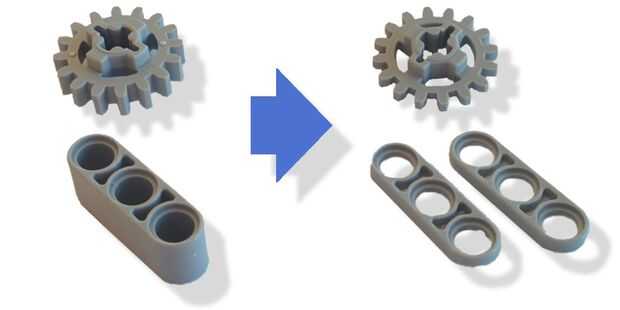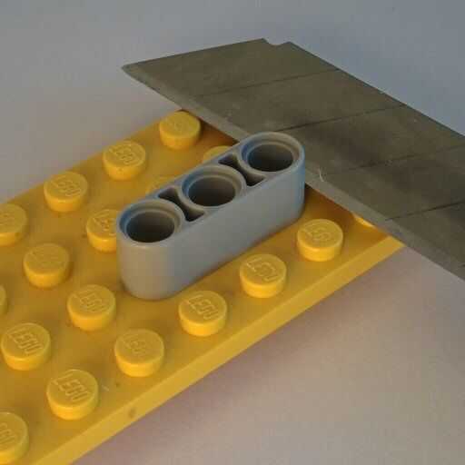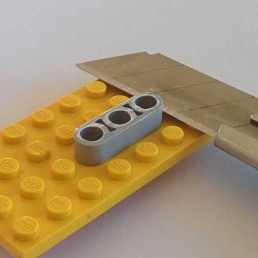 En primer lugar, cortar la liftarm de Lego para obtener dos piezas similares con el espesor de las patillas de Lego. Simplemente enchufe el liftarm en un plato y cortar en la parte superior de los pernos.