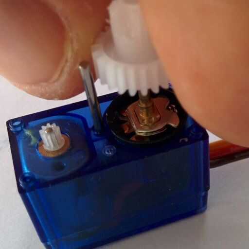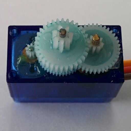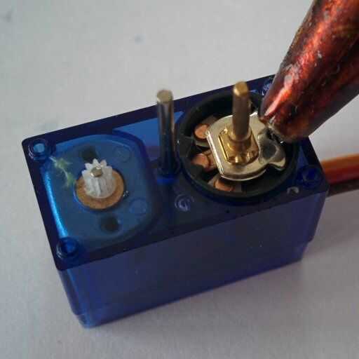 En primer lugar, desatornillar los cuatro tornillos de embalaje y retire la parte superior del motor servo. A continuación, quite todos los engranajes pequeños para acceder al potenciómetro.
