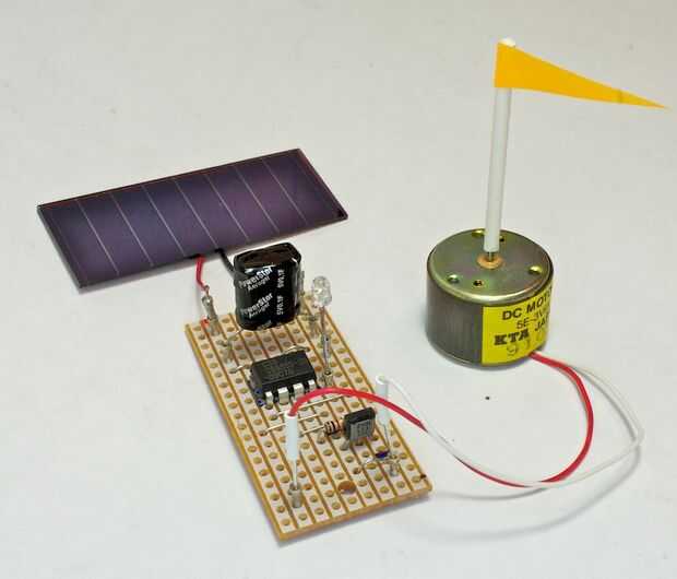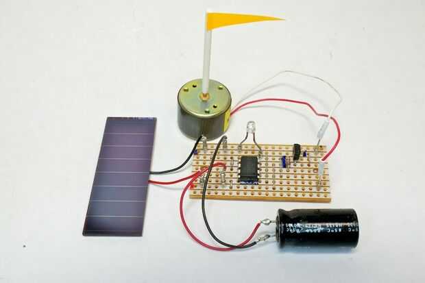 El motor es un modelo actual baja conveniente para la operación solar. La resistencia estática de los motores que funcionan con motores solares es en el barrio de 10 ohmios. Un motor típico "juguete" a ejecutar en una batería o dos debajo de 2 Ohms que es mucho demasiado bajo para este tipo de aplicación; el condensador se descarga a través de un motor de esto antes de que incluso comience a moverse.