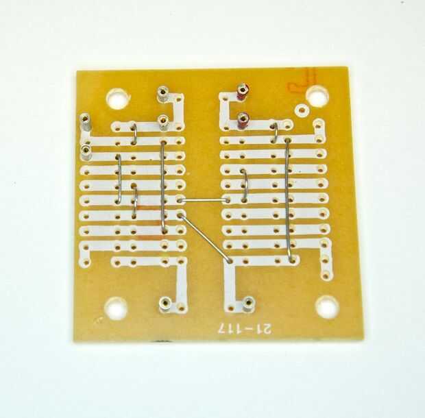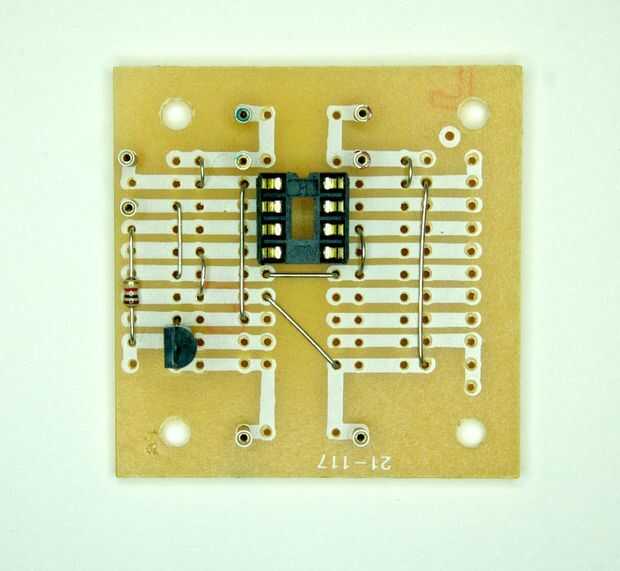 Esta fotografía muestra el circuito en un "Protoboard de experimentador I.C." hecha por DATAK (# 12-607).  Detalles del diseño se muestran en las fotografías inferiores.