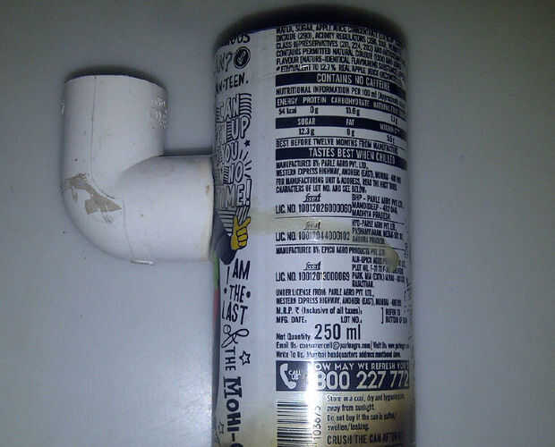 Para esto que necesitamos una bebida fría y con el cortador de metal ayuda, corte la parte superior de 1,5 cm de la superficie y hacer un agujero cuyo diámetro igual al diámetro interior de codo en el lado de puede y con la ayuda del codo del palillo de pegamento en ella.