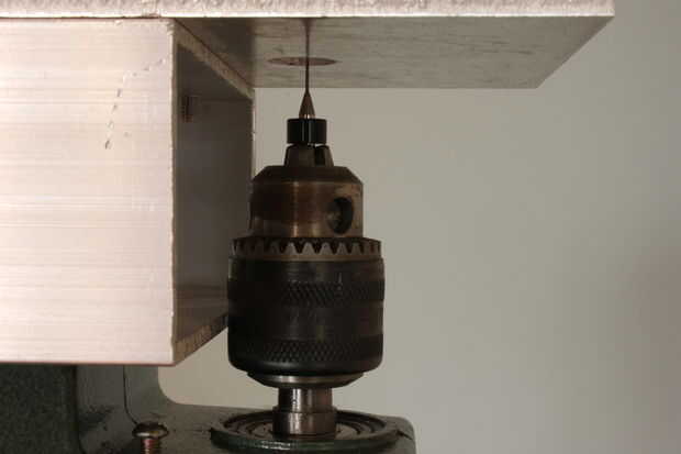 Puesto que el eje está tan cerca de la placa, es necesario totalmente Abra el portabrocas y la broca del "meneo" en su lugar. Una vez que has hecho un par de veces es bastante fácil.