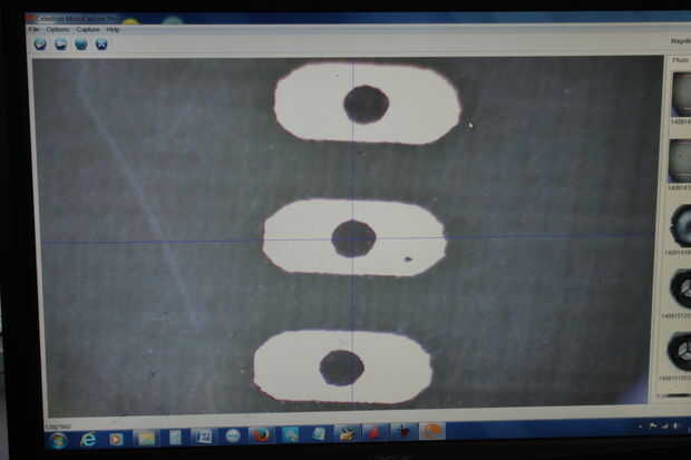 El taladro puede manejar PCB hasta 4,5 pulgadas de ancho. Taladro, inserte la broca adecuada, la broca, encienda el microscopio y el software a pantalla completa. Coloque el punto de mira en el centro del agujero. Sujete la placa firmemente con ambas manos y presione suavemente el pedal. Debe tener un agujero perfectamente centrado! La foto final muestra un agujero.021 perfectamente centrada en un cojín.