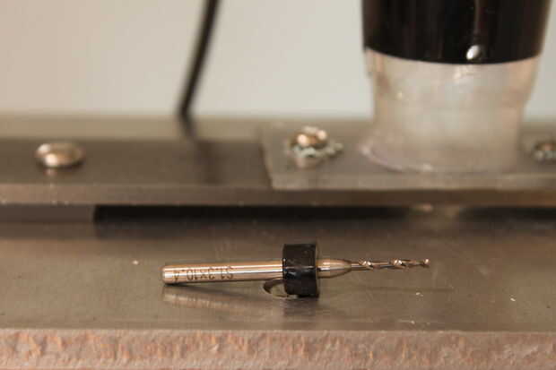 El taladro está diseñado para utilizar las brocas de carburo larga 1,5 pulgadas usadas para perforar PCB. Estos ejercicios tienen un vástago de diámetro.125 pulgadas y vienen con o sin anillos de profundidad. Fuertemente sugiero utilizar anillos - que hace a posicionamiento de la broca de corona mucho más fácil!