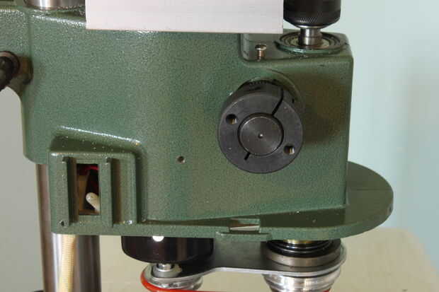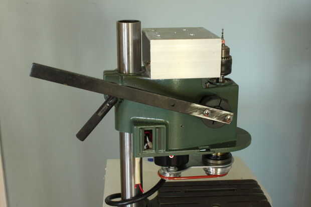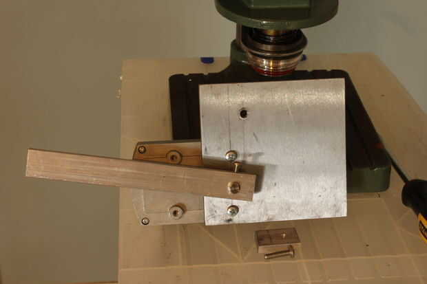 Para hacer el brazo del taladro, perfore dos 7/32 (. 219) agujeros en la barra 10 pulgadas x.25 x.625 acero 30 mm. Limpiar y eliminar las rebabas de los agujeros, luego utilizar M5 x.8 pitch x tornillos largos 20mm para fijar la palanca al collar de eje de 20mm. Perfore un 3/32 (. 09375).75 pulgadas desde el otro extremo del brazo de taladro del agujero.