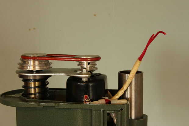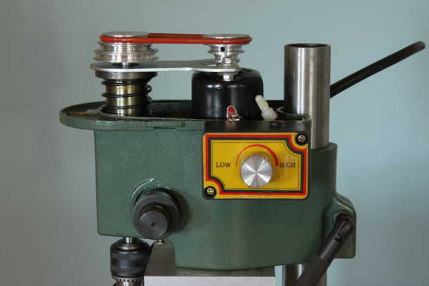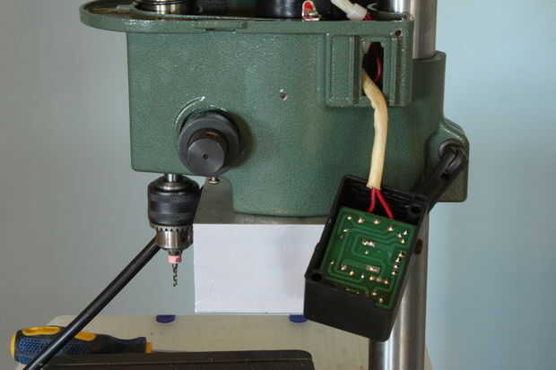 Retire los tornillos que sujetan la caja del regulador de velocidad. Retire la perilla y la tuerca de control grande y lavadora debajo de él y luego tire la tarjeta controladora de velocidad fuera de la caja. Marque el cable va al switch en el potenciómetro con un marcador negro, luego cortar dos cables cerca de la PCB. Guardar la hoja de plástico aislante. Tire de los cables por el agujero rectangular en el cabezal y dejarlos en la cabina del cabezal. Ponga el regulador de velocidad con todas sus partes a un lado por ahora.