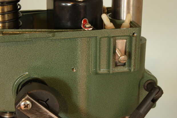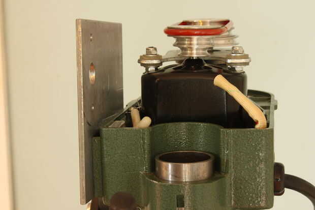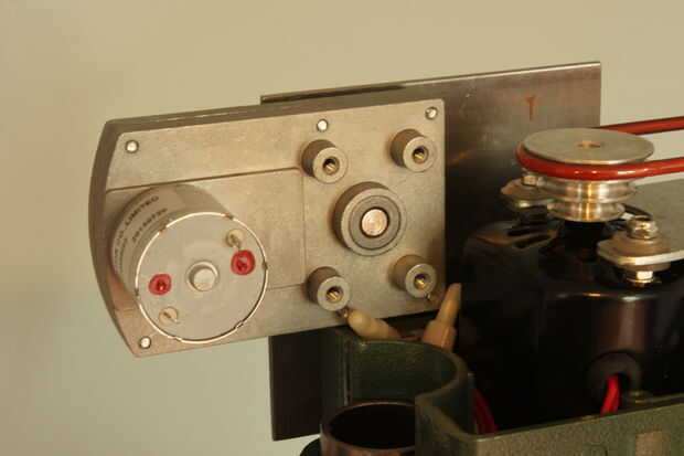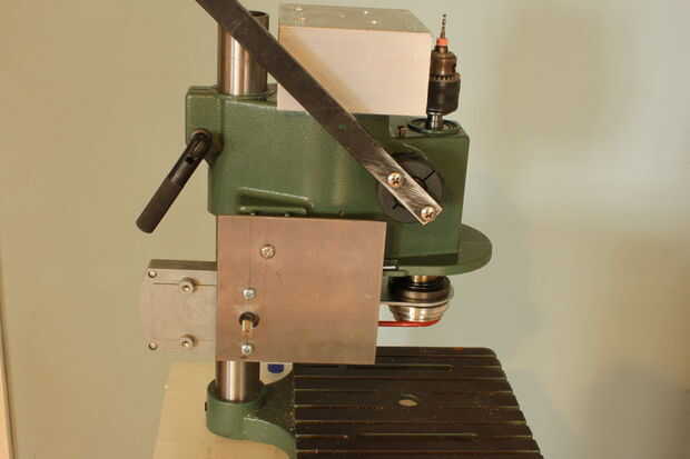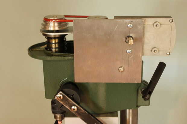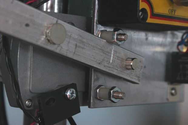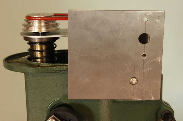 La placa del Motor se monta en el cabezal por un casero"palanca". Corte un pedazo de una pulgada de.250 x.75 pulgadas barra de aluminio y perfore un #21 (. 159) agujero en el centro. Grifo para un tornillo 10-32.