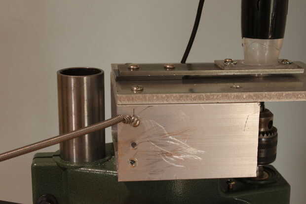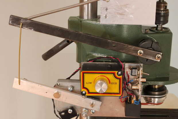 Utilice un trozo de varilla de latón de.072 pulgadas para conectar el brazo de palanca del Motor y el brazo del taladro Afloje el collar del eje en el brazo del taladro que un ángulo recto de la curva aproximadamente 1,5 pulgadas de un extremo de la varilla de latón y una segunda curva de ángulo recto en la misma dirección alrededor de 4,5 pulgadas de la primera. Cortar la varilla a 1,5 pulgadas de la segunda curva.