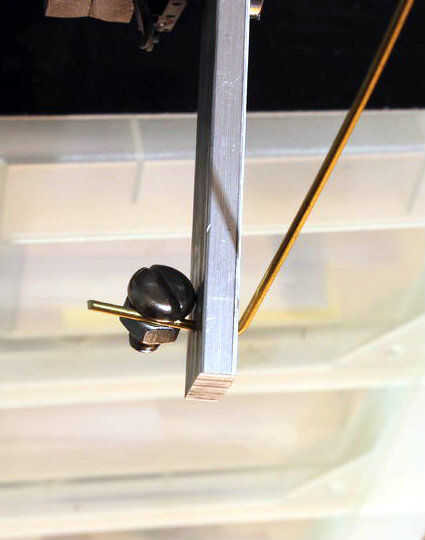 Corte una longitud de 5 pulgadas de la primavera. Usar un wirecutter para separar un par de vueltas para formar un ojal en cada extremo del resorte. Deslice un extremo de la varilla de latón a través del orificio en el extremo del brazo de taladro, luego deslice un ojete de resorte sobre la varilla. Después de las fotos, utilice un 1/4-20 perno y tuerca para sujetar la punta de la varilla. Perfore un 9/64 (. 141) del agujero en la esquina superior izquierda del rectángulo de aluminio como se indica, luego asegure el otro extremo del resorte para el rectángulo de aluminio con un 6-32 tornillo y tuerca. Ver las fotos.
