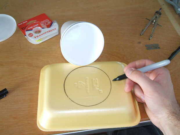 Mida el diámetro de una de las copas de espuma de poliestireno y utilice su compás para dibujar un círculo de igual tamaño en la bandeja del congelador. Se puede trazar el círculo directamente fuera de la Copa, pero hará difícil de localizar el centro del círculo, que usted tendrá que hacer.