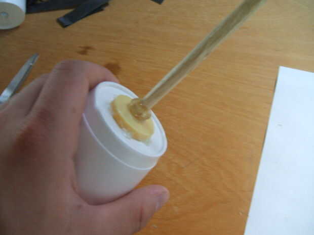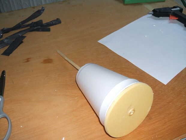 Hacer un agujero en el centro de una de las copas de espuma de poliestireno y pegar el disco de espuma de poliestireno en su parte inferior. Coloque el pasador a través de ambos orificios y pegar en su lugar. También puede hacer una espuma pequeña (1") del disco y colocarlo en la parte inferior de la Copa, pero esto no es realmente necesario.