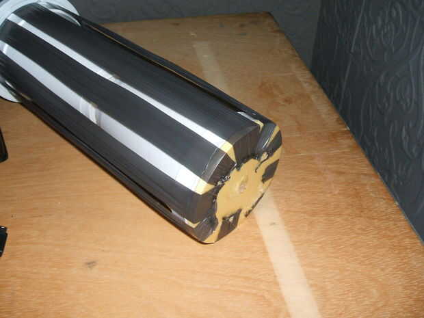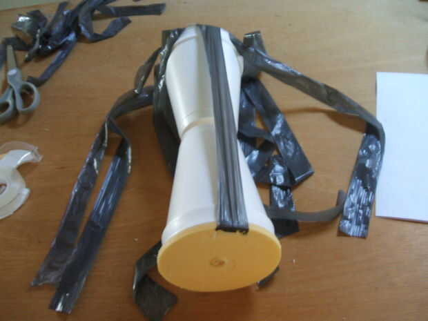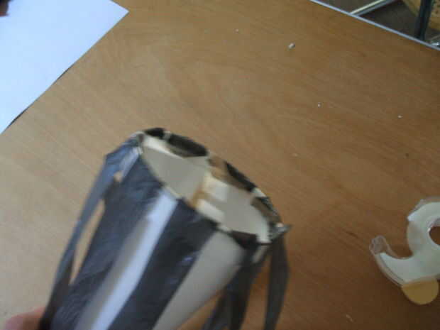 Comenzar a pegar las tiras en el disco de espuma de poliestireno en el otro recipiente. Hacer que las tiras de burla cuando te pegue, pero no tire duro o causará la taza de bamboleo para ser centro.